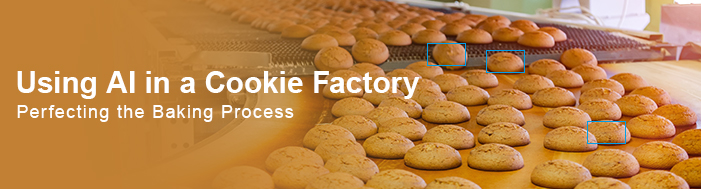 | A factory uses AI to ensure individual cookies are perfectly baked before packing and shipping. AI automatically controls oven temperatures by detecting slight color changes in cookies to maintain high quality control. |