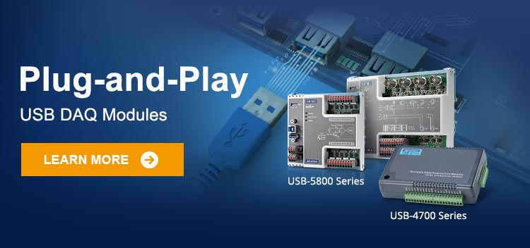 | The USB-5800/4700 series USB DAQ modules from Advantech are well-suited for various industrial applications demanding convenient, portable I/O capabilities. Featuring a plug-and-play USB interface, these modules enable users to effortlessly enhance or update their system's I/O functionality. This is particularly useful for systems lacking PCI/PCIe expansion. |