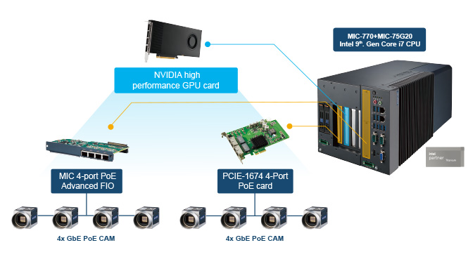 | An AI solution can help to enhance recycling performance by accelerating object identification and classification capabilities. Advantech’s MIC-770 + MIC-75G20 provides a high-performance processor system that was able to accommodate one GPU card, and two 4-port Power over Ethernet (PoE) cards to connect eight cameras. It can also function in the industrial, harsh environments of a recycling plant.